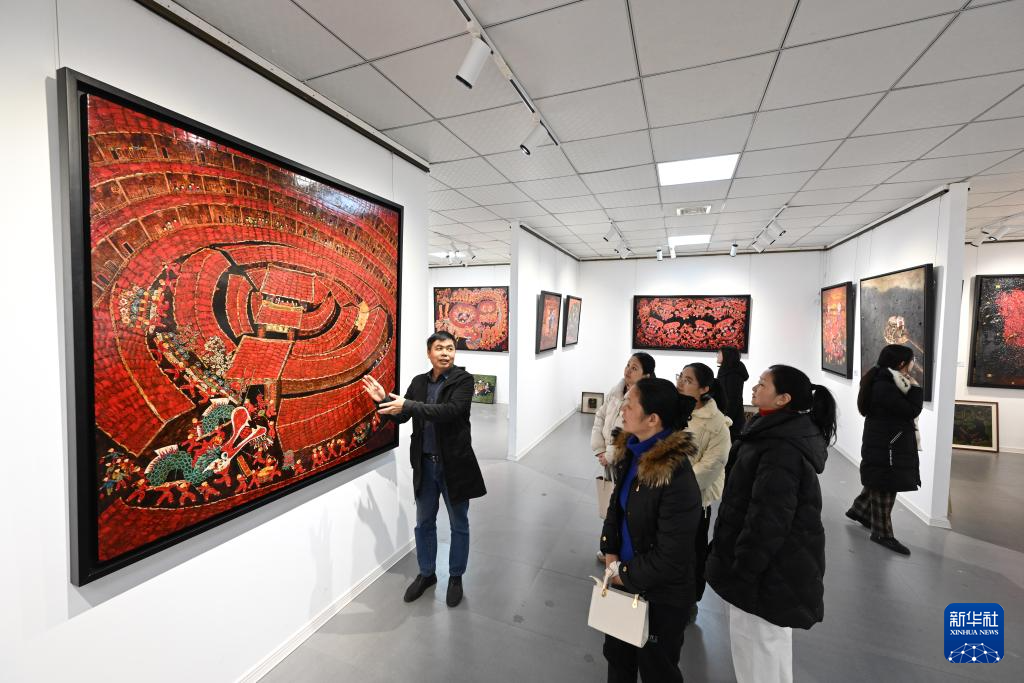 1月10日,在漳平市農民漆畫展廳,漳平市美術館館長陳永鳳(左)向農民畫愛好者介紹自己創作的農民漆畫作品。