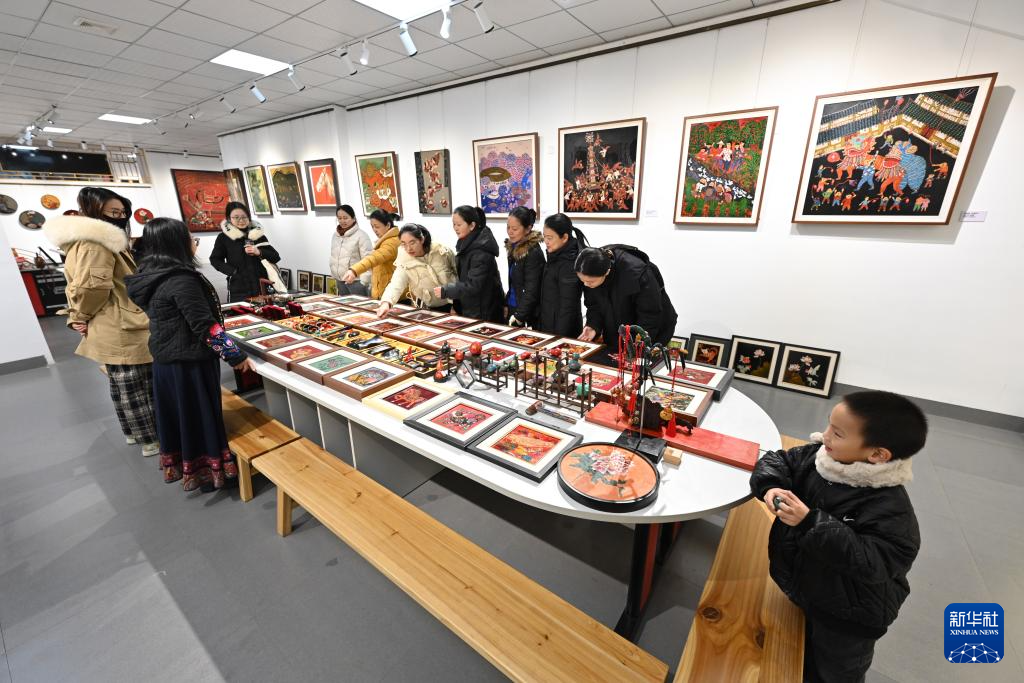 1月10日,農民畫愛好者在漳平市農民漆畫展廳觀摩農民漆畫和漆藝展品。