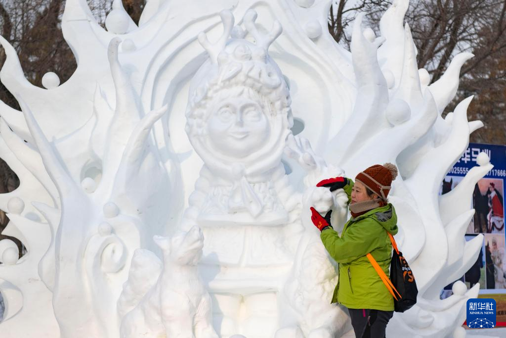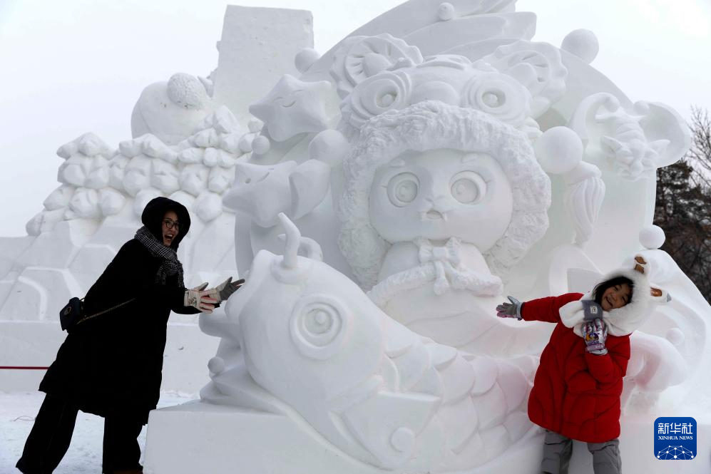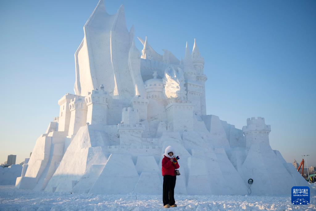 1月5日,在哈爾濱冰雪大世界園區附近,游客在雪雕旁拍照。