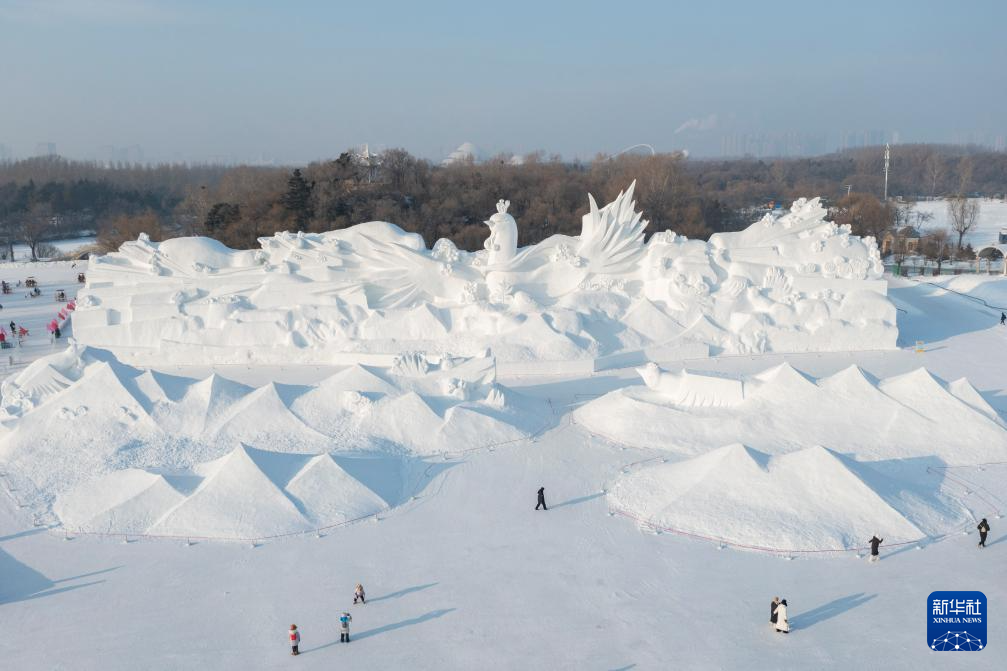 1月6日,在哈爾濱太陽島雪博會園區,游客觀賞本屆雪博會主塑《雪艷春》(無人機照片)?!堆┢G春》以“百鳥朝鳳”為靈感源泉,鳥與梅花元素相互交織,長100米,高30米。