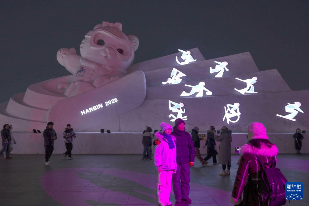 1月5日,在哈爾濱冰雪大世界園區,游客在亞冬會吉祥物雪雕旁拍照。