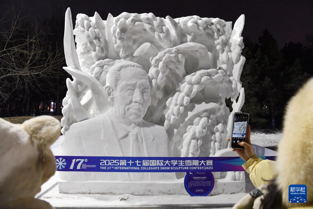 1月7日,人們在哈爾濱工程大學校園內拍攝雪雕作品《稻田里的中國夢》。該作品獲2025第十七屆國際大學生雪雕大賽特等獎。