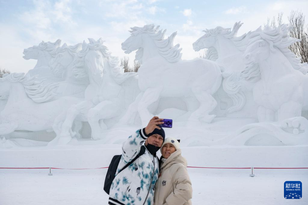 1月13日,在哈爾濱太陽島雪博會園區,游客在大型雪雕《八駿踏雪》旁拍照。