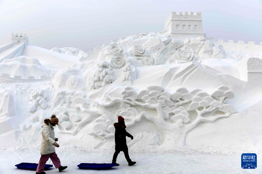 1月13日,在哈爾濱太陽島雪博會園區,游客從大型長城雪雕下走過。