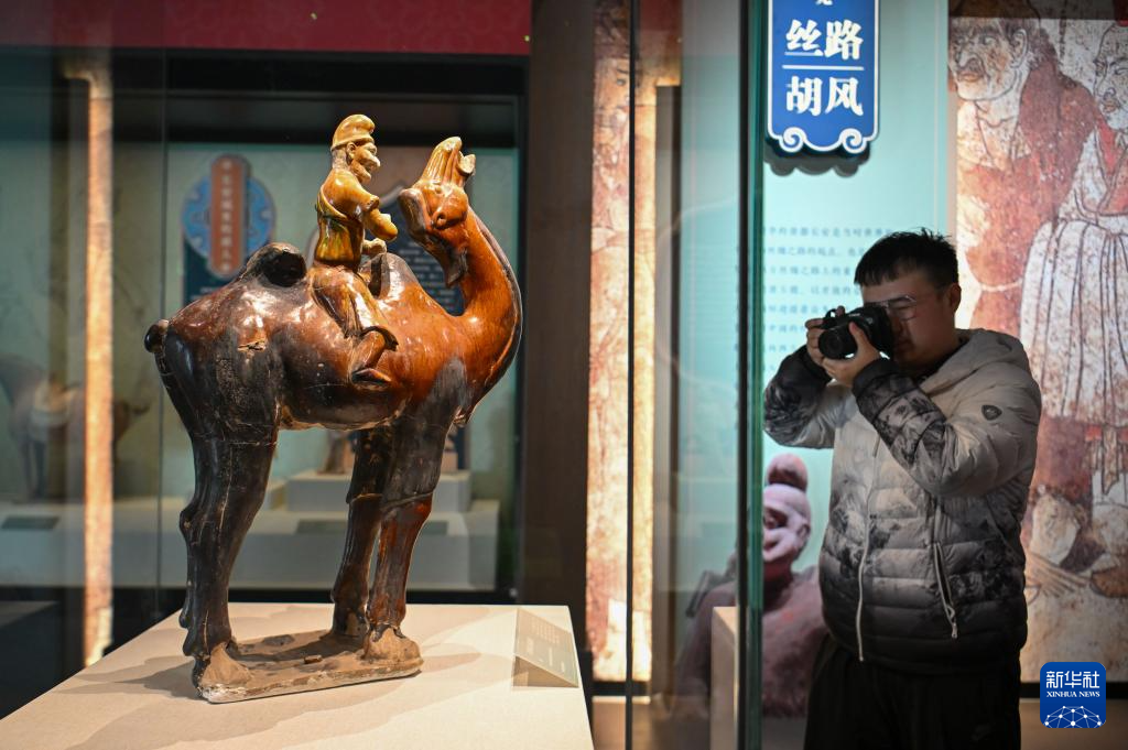 1月15日,觀眾在拍攝“長安三萬里——陜西唐代文物精華展”展出的三彩胡人騎駝俑。