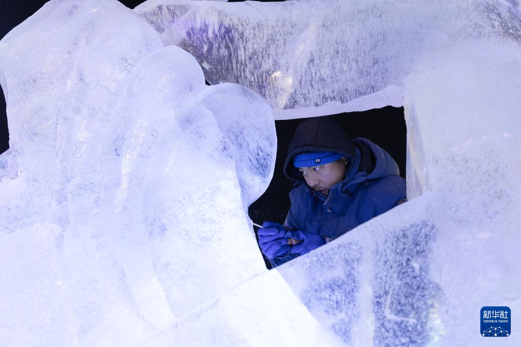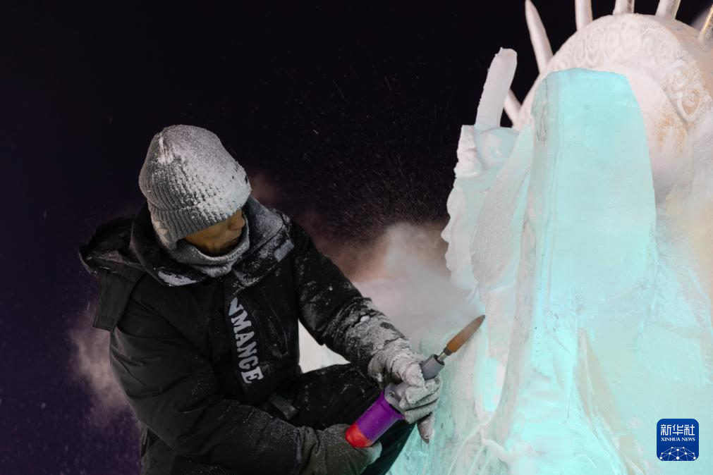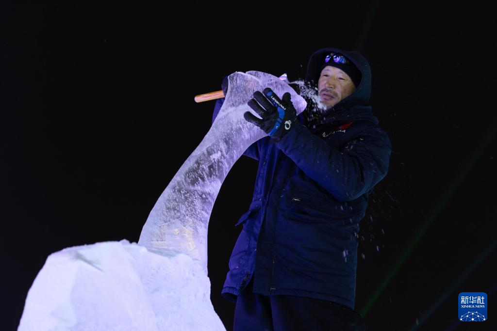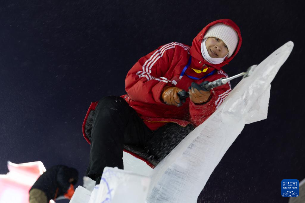 1月15日,參賽選手在哈爾濱冰雪大世界園區進行冰雕創作。