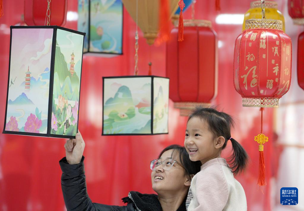 1月16日,小朋友在河北省群眾藝術館迎新春民俗文化展活動中懸掛燈籠。