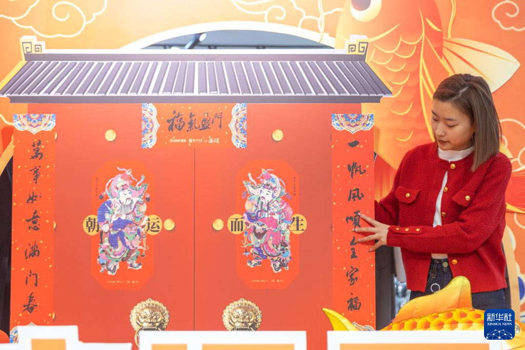 1月15日,在重慶市梁平區一商場,商場工作人員在擺放帶有梁平木版年畫元素的新春裝飾。
