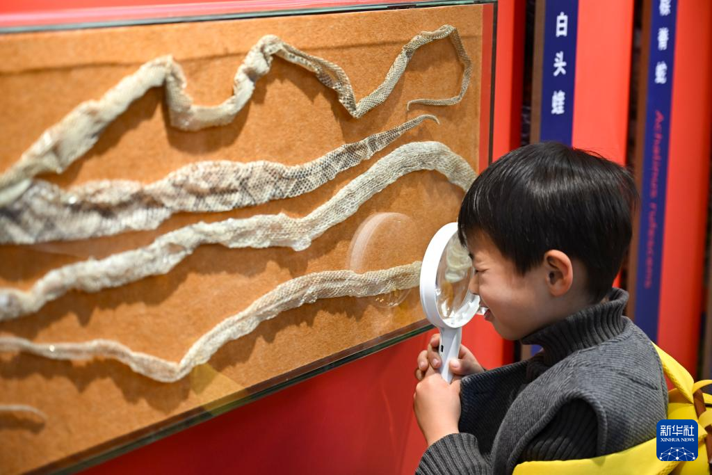 1月18日,小朋友在上海自然博物館蛇年生肖特展上用放大鏡觀察蛇蛻標本。