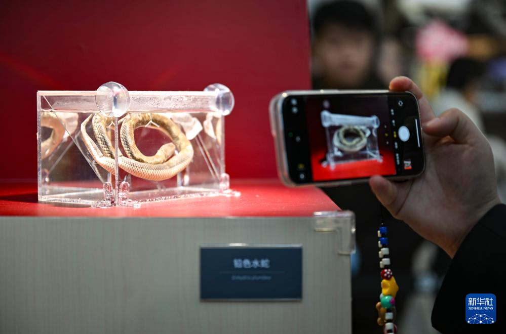 1月18日,觀眾在上海自然博物館蛇年生肖特展上拍攝鉛色水蛇標本。