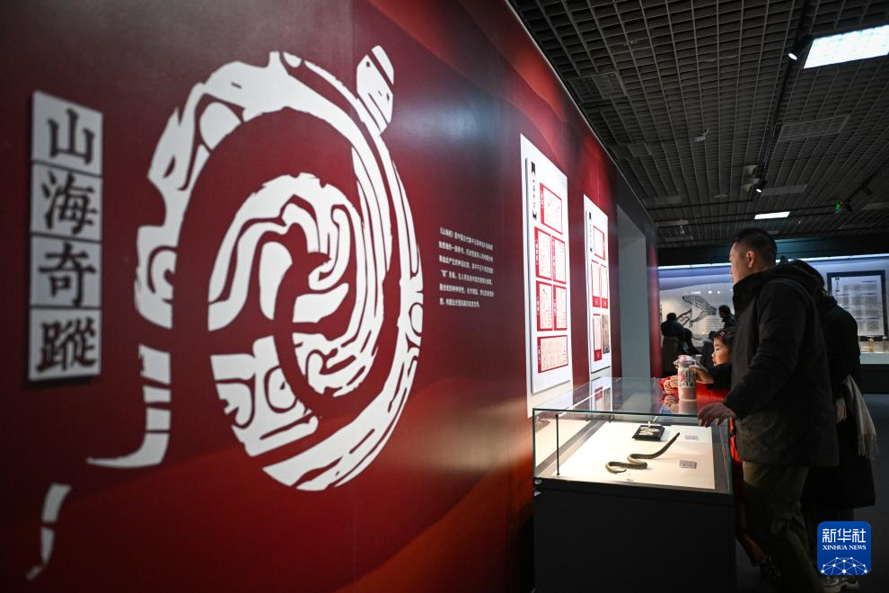 1月18日,觀眾在展覽中觀看介紹《山海經》中蛇形象的展板。