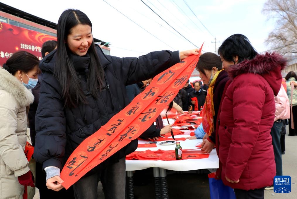 1月21日,在甘肅省平涼市靜寧縣原安鎮齊埂村舉行的靜寧縣文化科技衛生“三下鄉”集中示范活動現場,村民喜領志愿者書寫的春聯。
