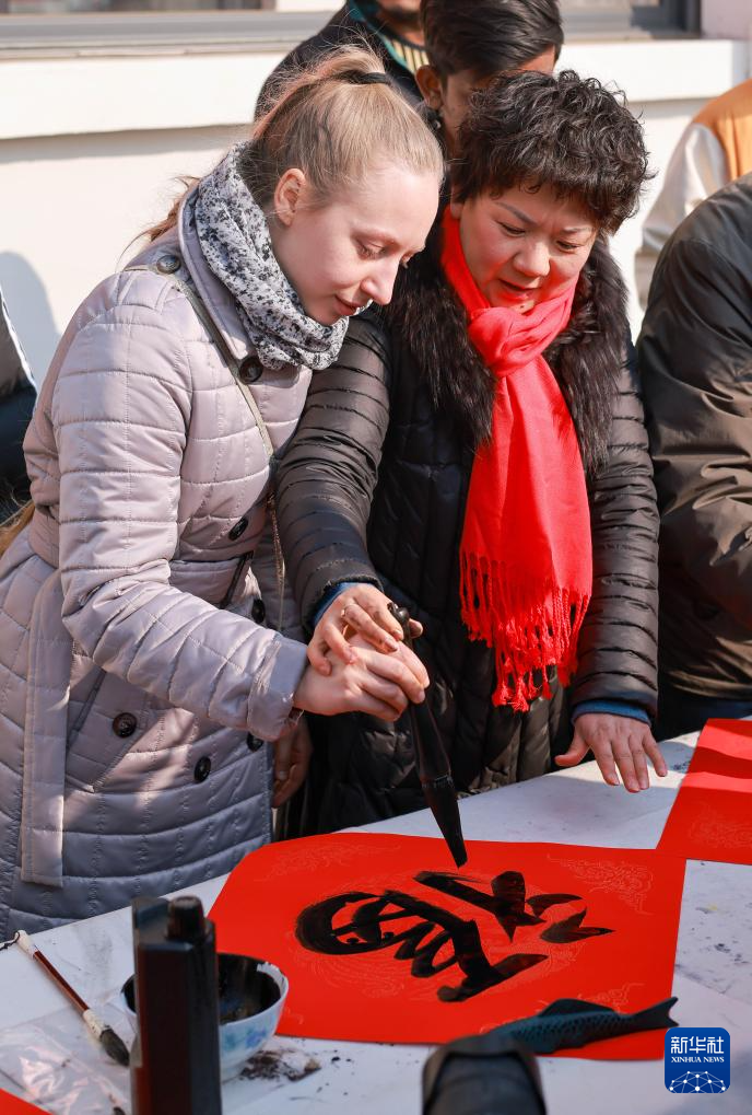 1月21日,在山東省棗莊市薛城區魯封橋大集,外國留學生體驗寫春聯。