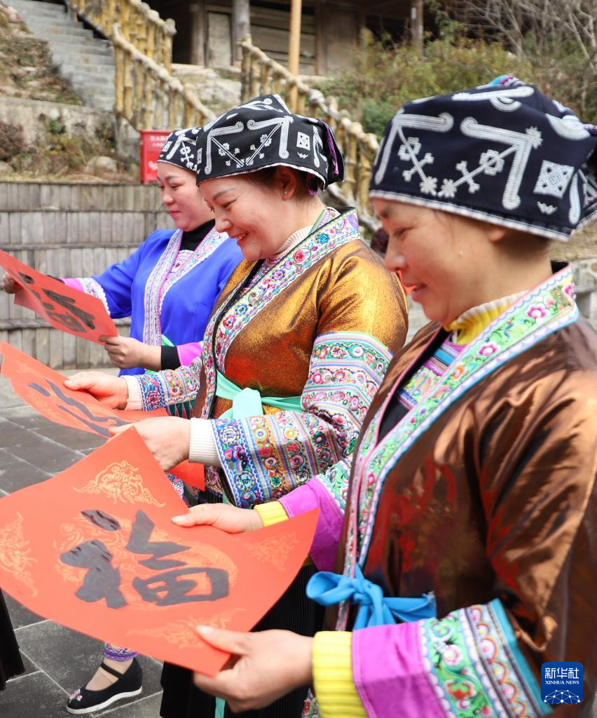 1月20日,在廣西柳州市融水苗族自治縣四榮鄉榮地村大屯侗寨,村民在送春聯活動中領取福字。