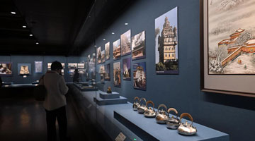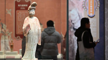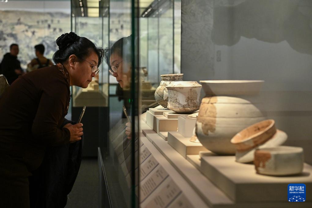 1月21日,參觀者在“萬古長歌——湖南史前文明圖卷展”上觀看陶器。