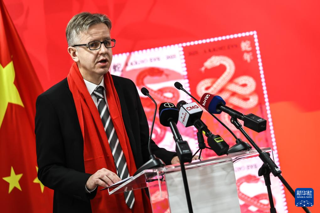 1月21日,匈牙利國家經濟部副國務秘書朗·蓋佐在布達佩斯舉行的中國農歷蛇年生肖郵票發行儀式上致辭。