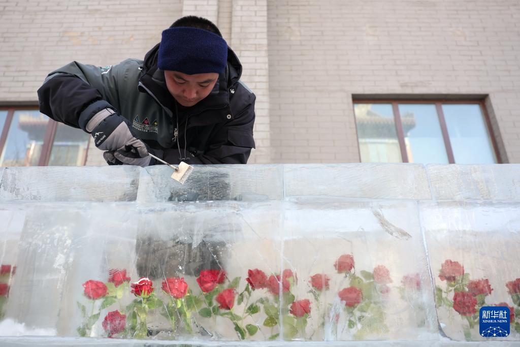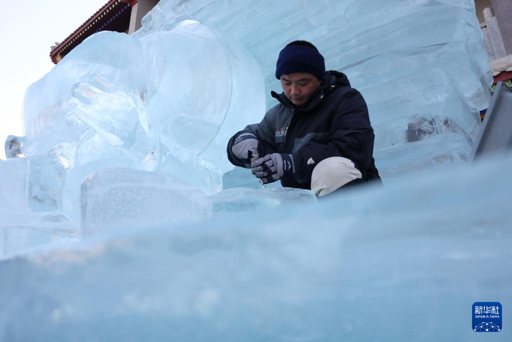 在甘肅省張掖市甘州區甘州府城景區內的冰雕展區,冰雕師趙浩在打磨一組冰雕作品(1月21日攝)。
