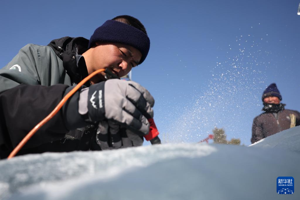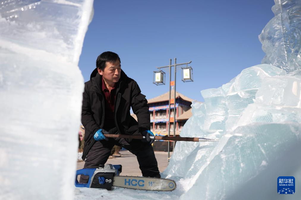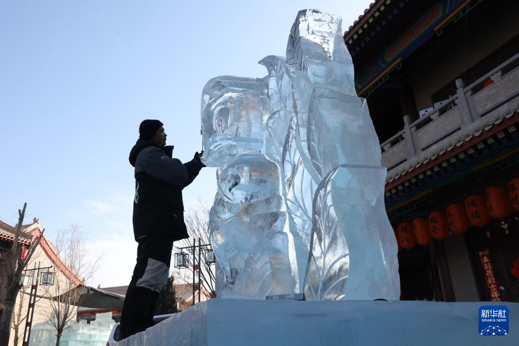 春節臨近,在甘肅省張掖市甘州區甘州府城景區內,36歲的冰雕師趙浩和他的團隊伙伴揮舞著工具,制作冰雕,為冰雕展做準備。