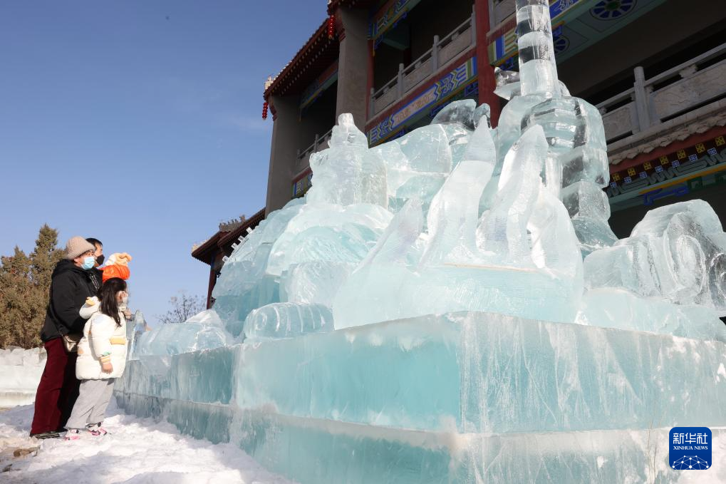 幾名游客在甘肅省張掖市甘州區甘州府城景區內的冰雕展區內參觀即將完工的冰雕作品(1月21日攝)。