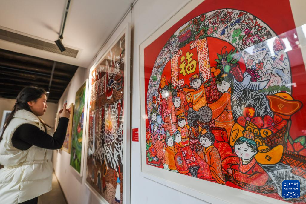 1月23日,游客在湖州吳興的小西街西岸美術館觀賞年畫美術作品。