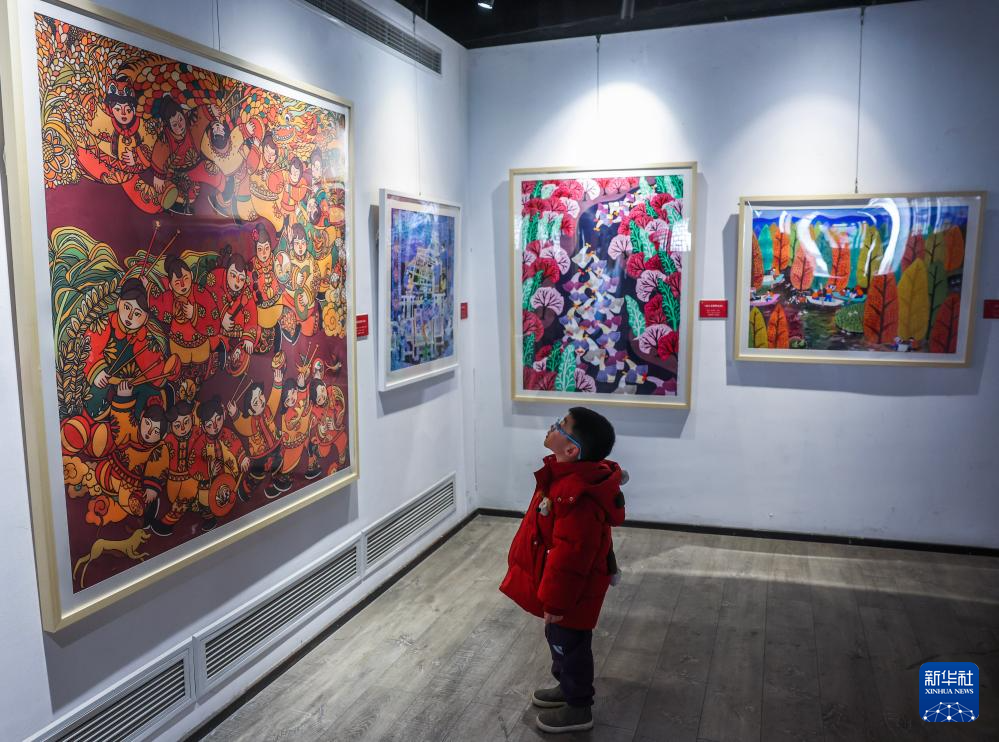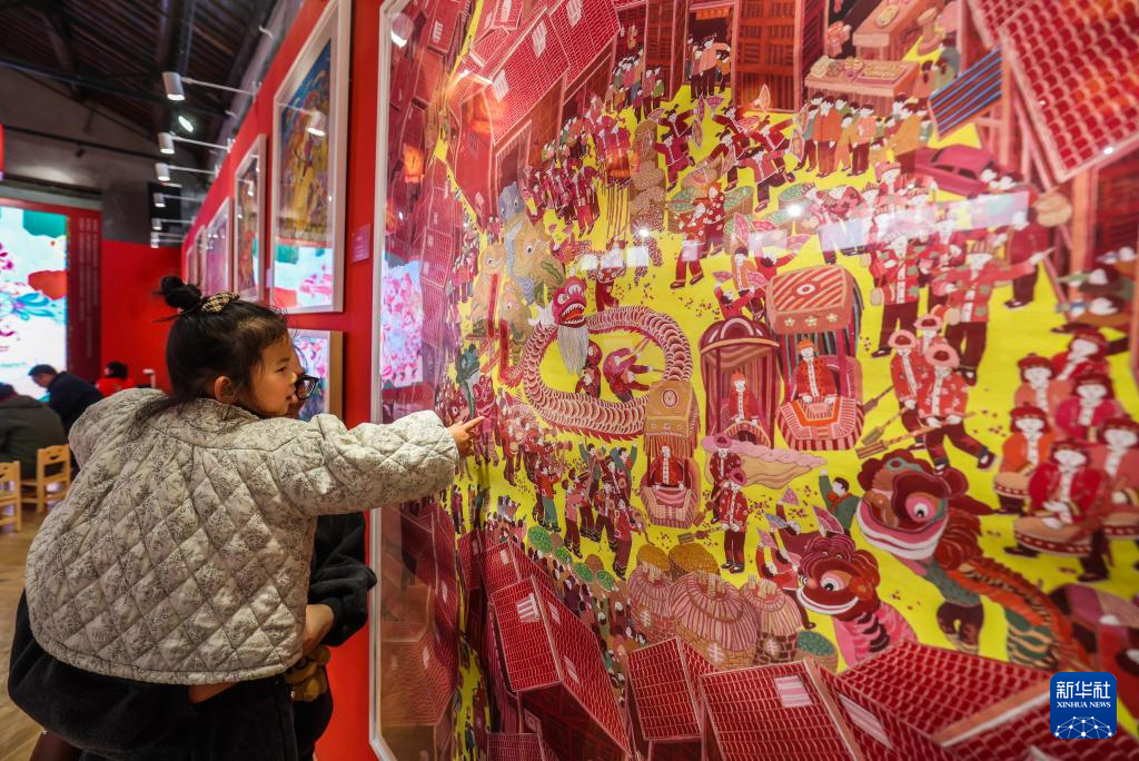 1月23日,一名小朋友在湖州吳興的小西街西岸美術館觀賞年畫美術作品。