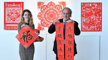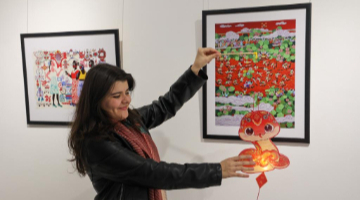 2月11日,畢六福展示印有卡通圖案和熊貓圖案的油紙傘。