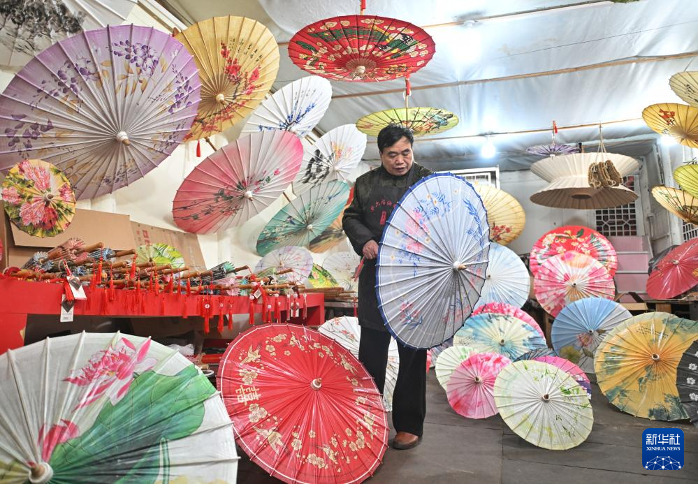 2月11日,畢六福在整理油紙傘。