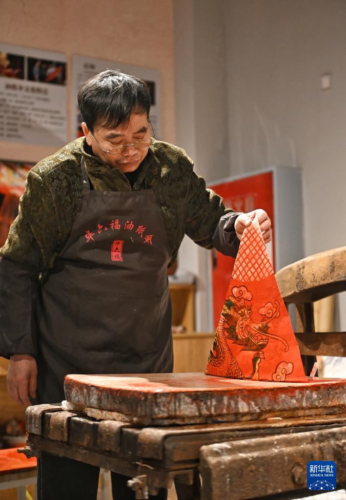2月11日,畢六福在用石板印刷術制作油紙傘圖案。