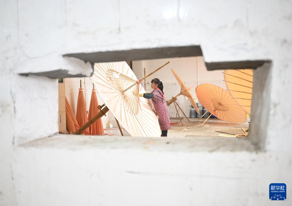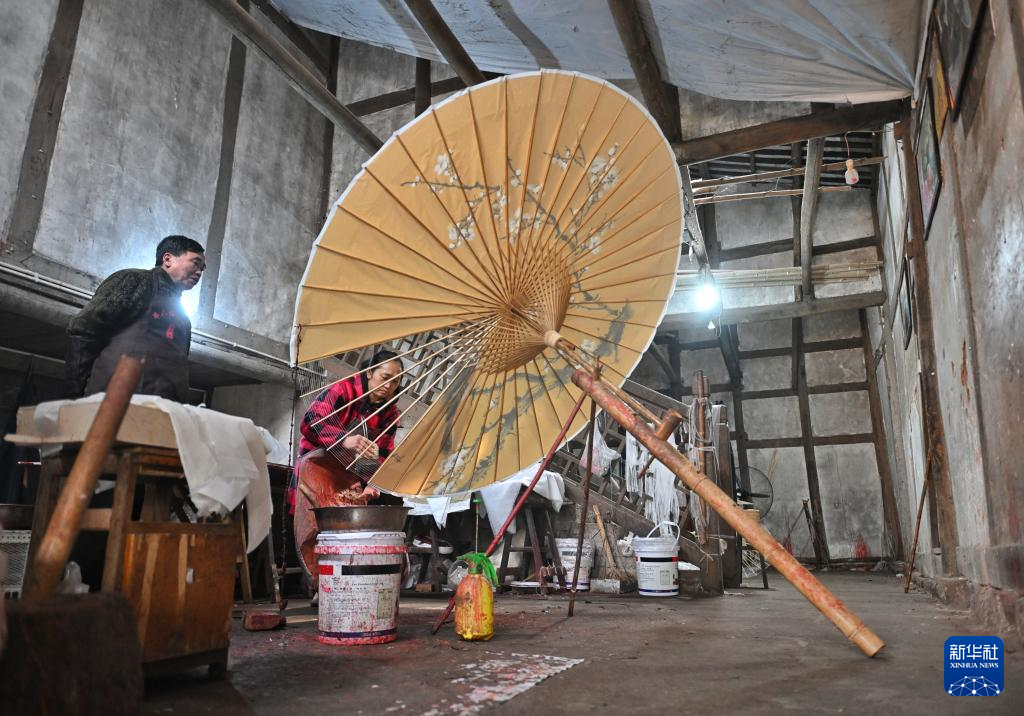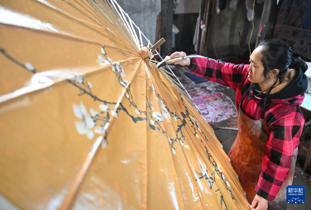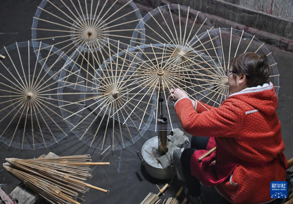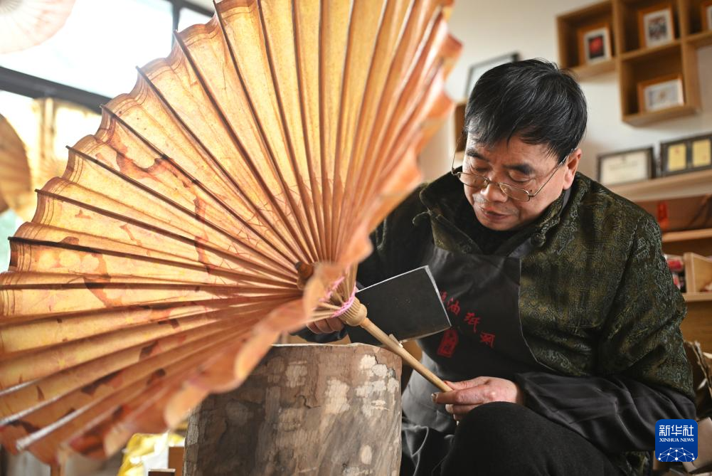 2月11日,制傘師在為油紙傘上桐油。