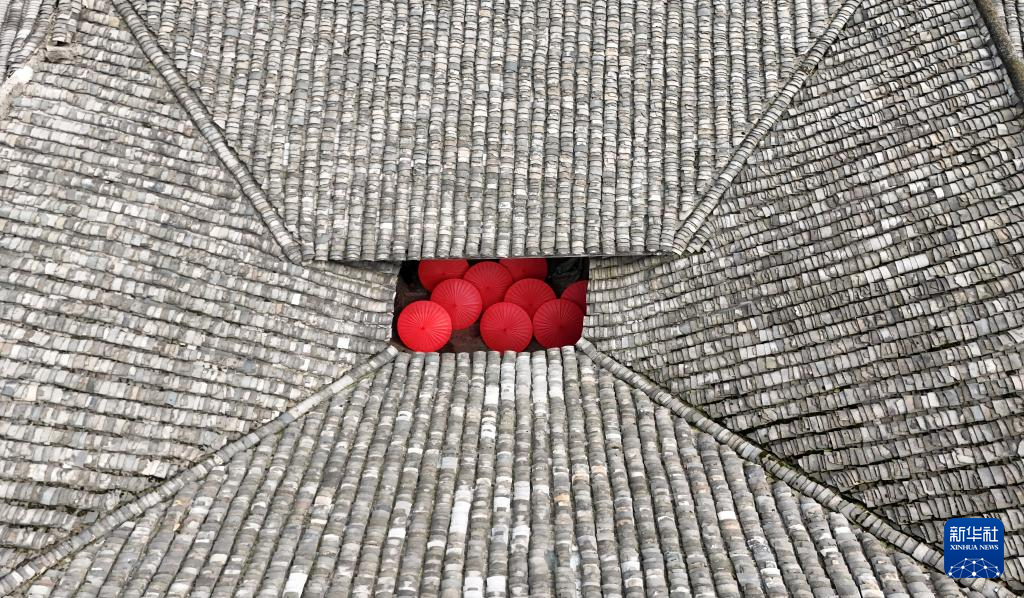 制傘師將油紙傘放到院子里晾曬(2月11日攝,無人機照片)。