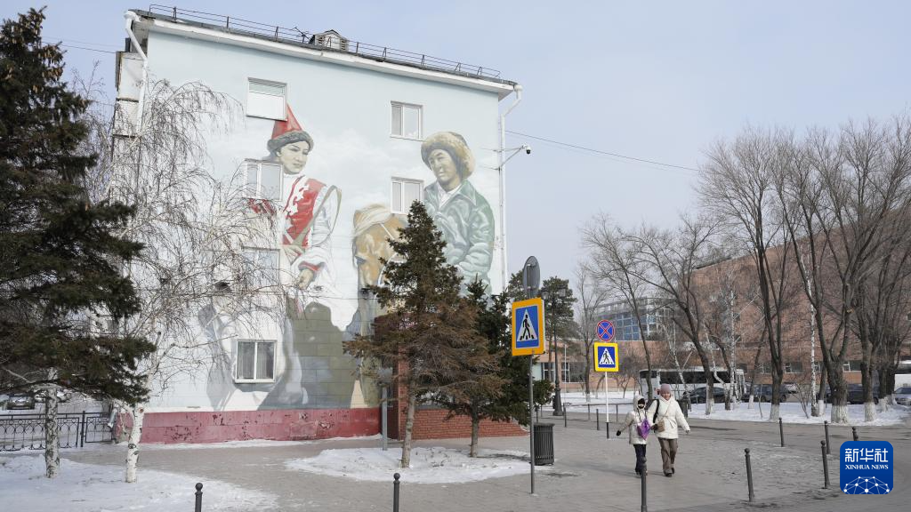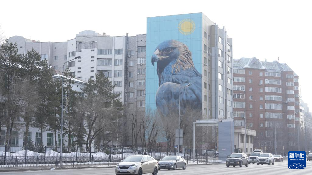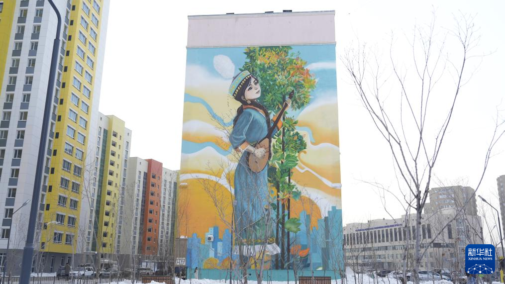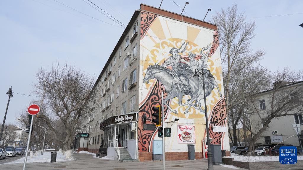 這是2月19日在哈薩克斯坦首都阿斯塔納市老城區拍攝的居民樓外立面的墻繪。
