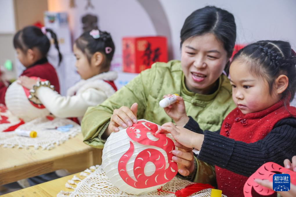 當日,浙江省湖州市長興縣李家巷鎮中心幼兒園的師生們以“非遺潤童心”為主題,開展新學期傳統文化體驗活動。孩子們在老師的指導下制作蛇年主題剪紙和燈籠、畫心愿、寫祝福,感受傳統文化魅力。