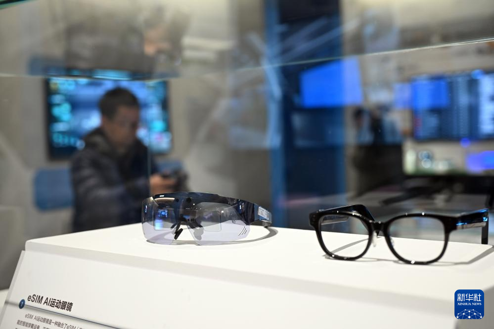 這是2月20日在網絡發展新圖景成就展上拍攝的AI運動眼鏡。