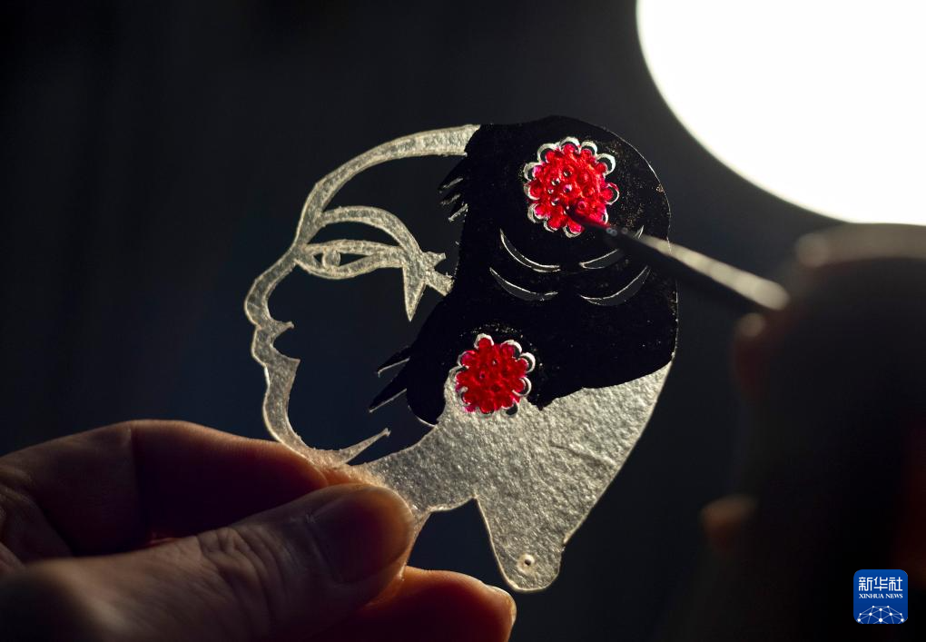 王彪的徒弟李其芳在整理表演用的影人(2月19日攝)。