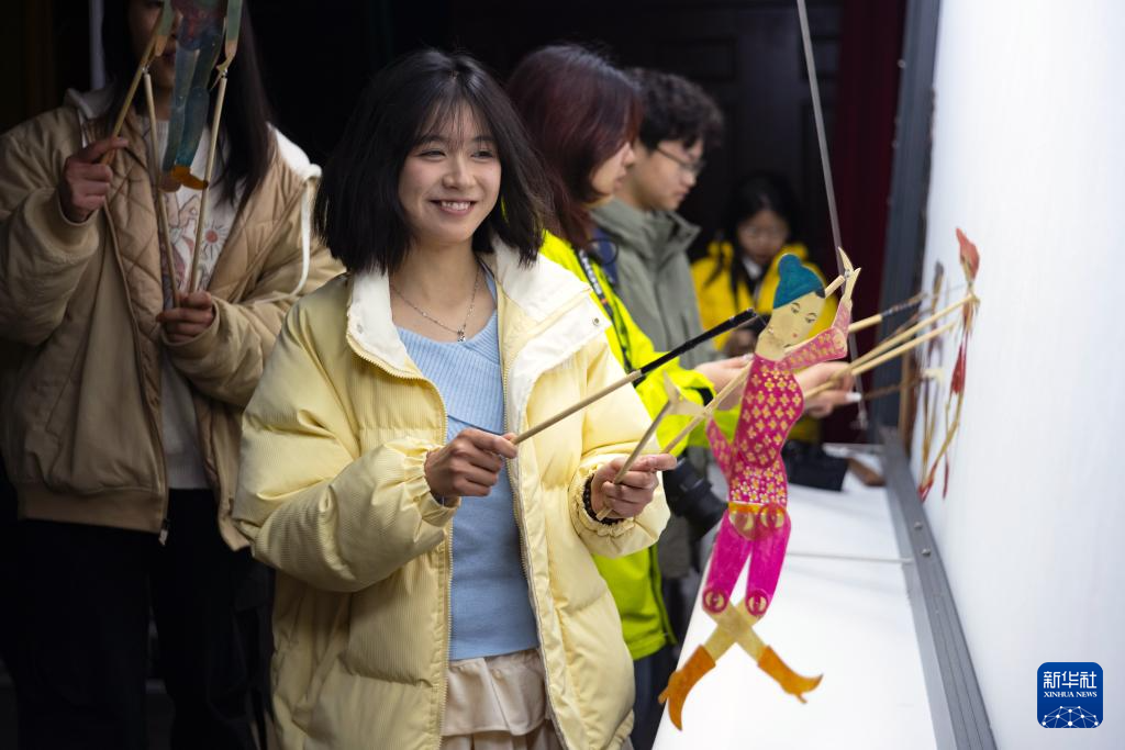 在位于閬中市的四川王皮影藝術博物館,年輕觀眾受邀上臺體驗表演皮影戲《迪斯科》(2月19日攝)。