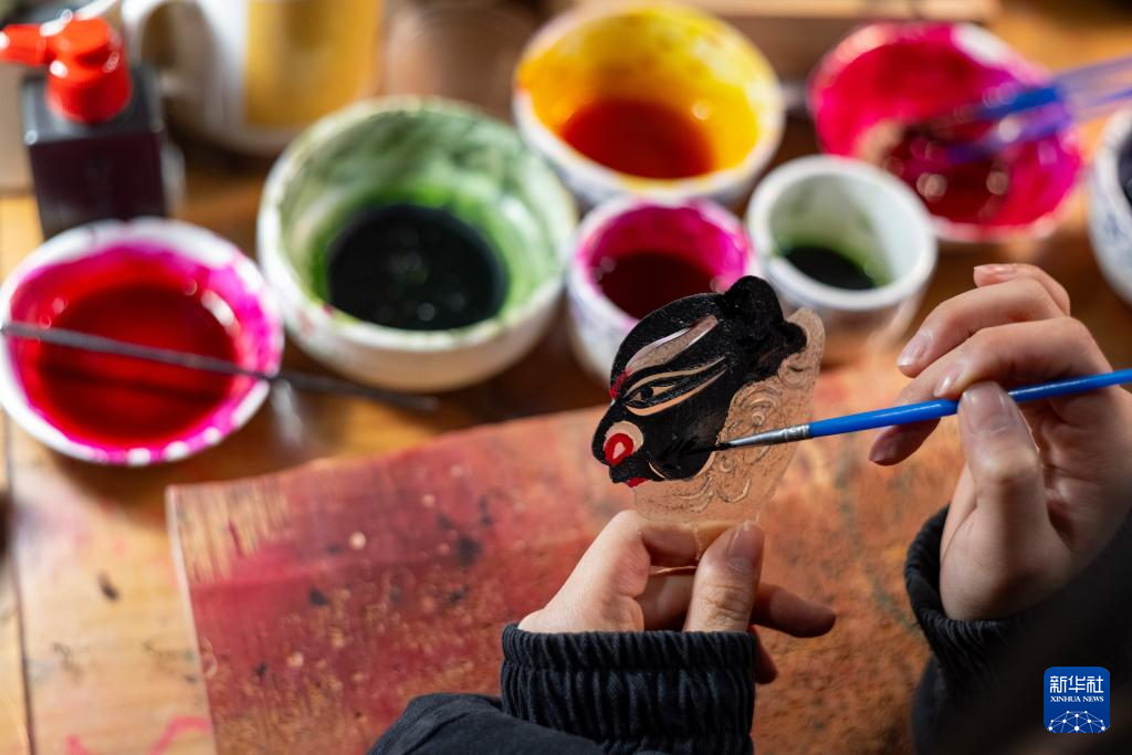 王彪的徒弟在給影人“張飛”的頭部上色(2月19日攝)。