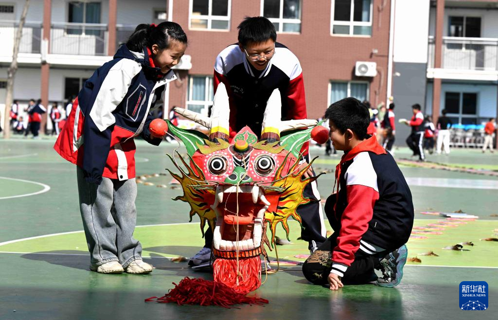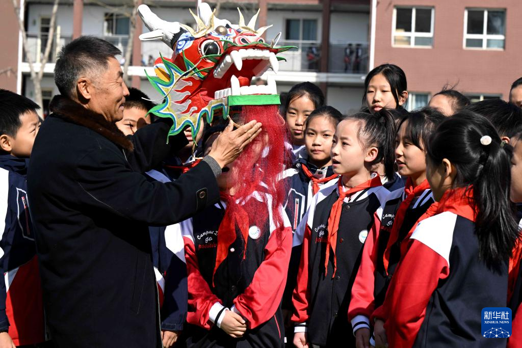 2月26日,石家莊市草場街小學學生在欣賞龍風箏。