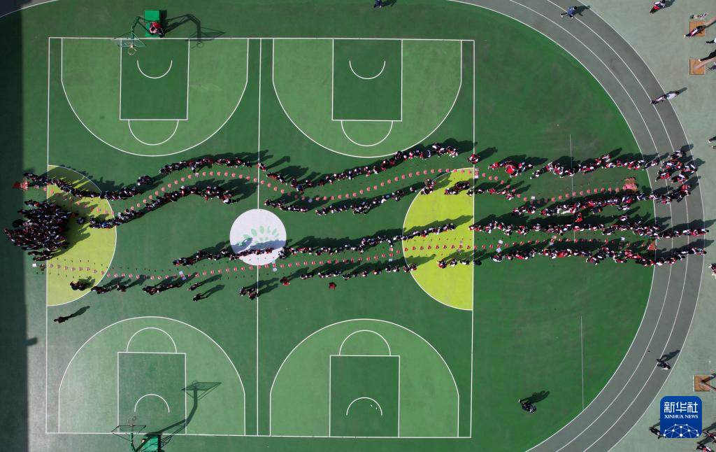 2月26日,石家莊市草場街小學學生在觀賞龍頭蜈蚣風箏(無人機照片)。