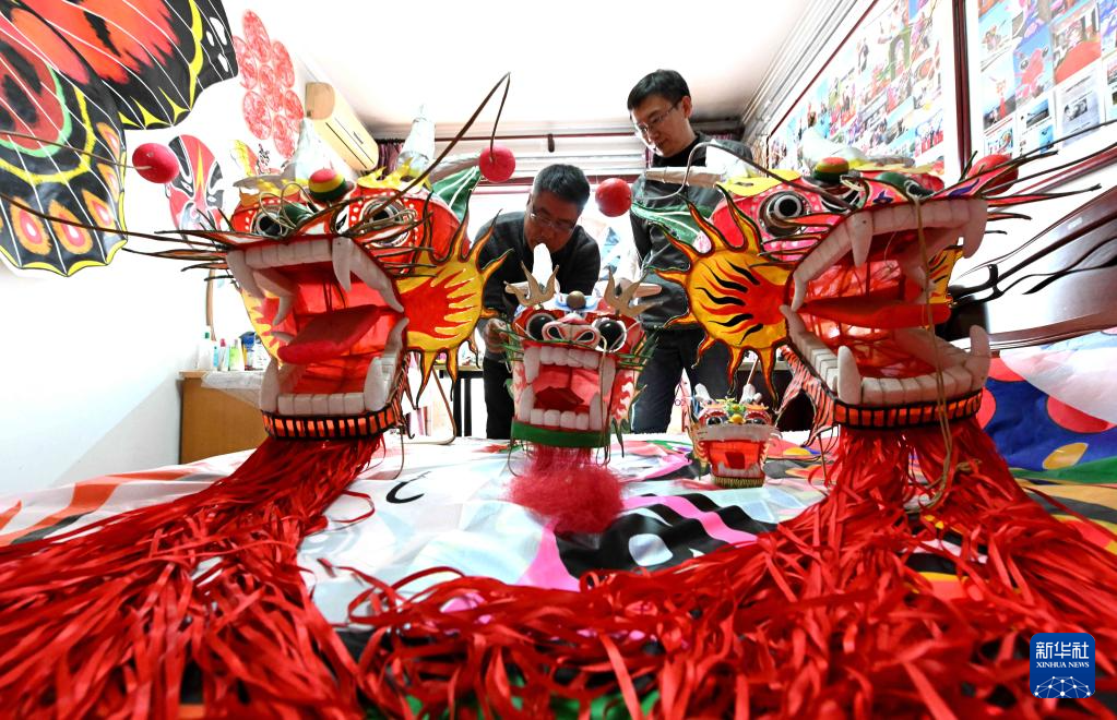 2月26日,王彥州(左)在石家莊市家中制作龍風箏。