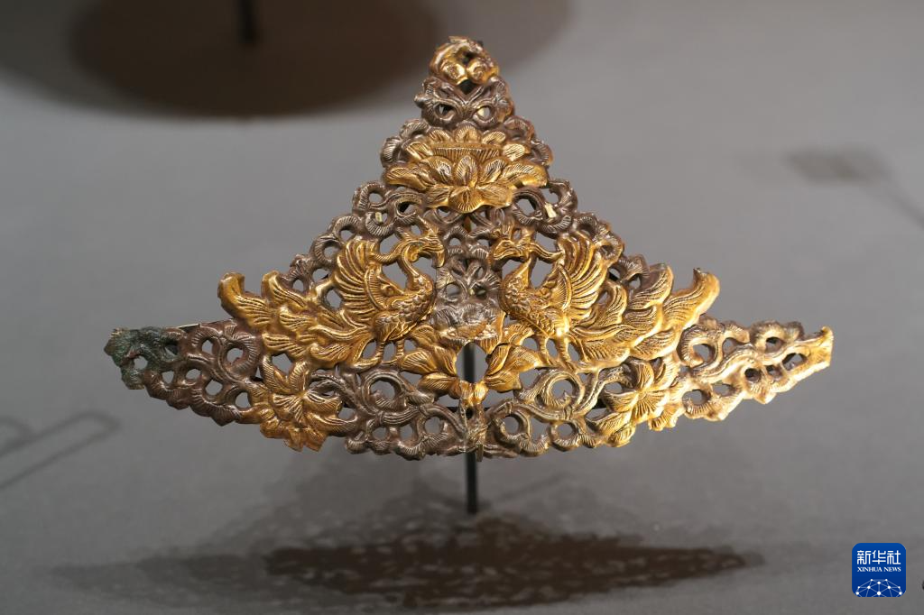 西部機場博物館展出的唐代文物鎏金銀釵(2月26日攝)。