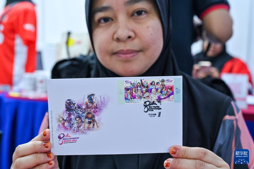 3月8日,在馬來西亞吉隆坡,一名集郵愛好者展示國際婦女節紀念郵戳首日封。