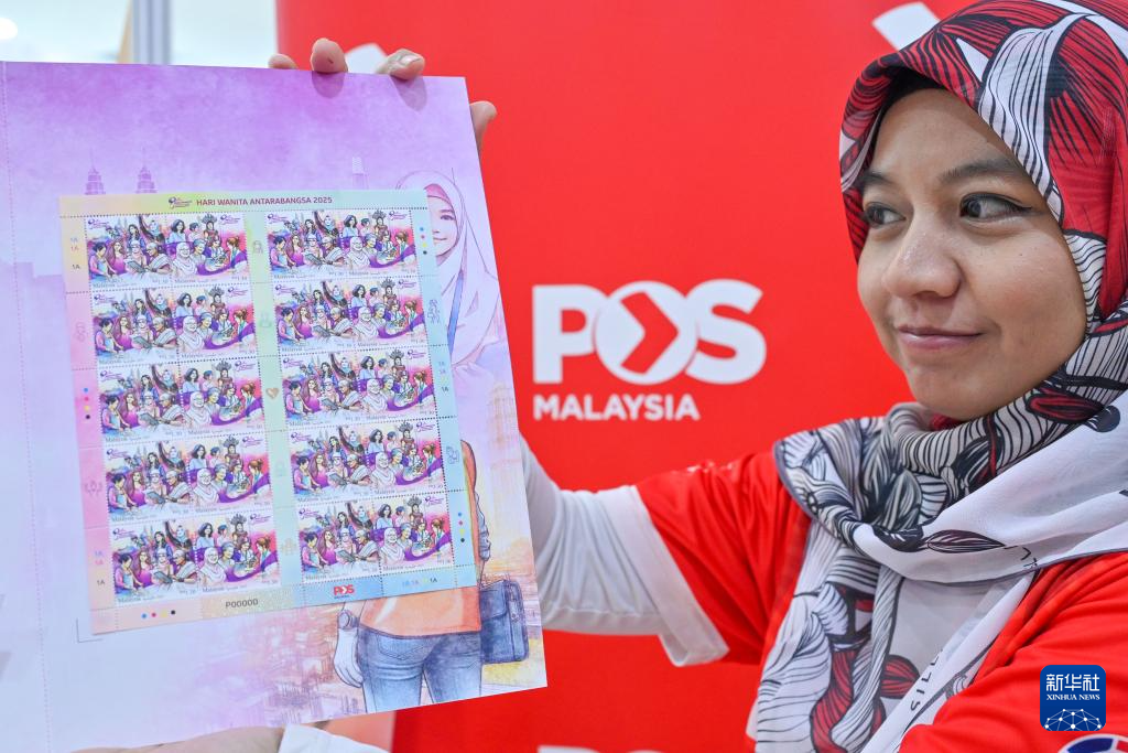 3月8日,在馬來西亞吉隆坡,一名馬來西亞郵政局工作人員展示國際婦女節紀念郵票。