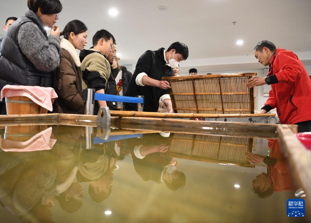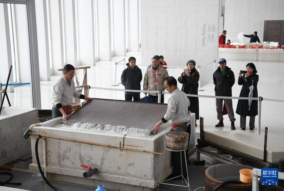 3月15日,游客在涇縣宣紙文化園觀看宣紙撈紙工藝展示。