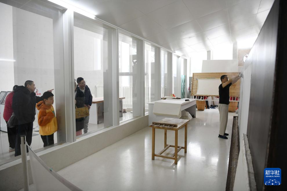 3月15日,游客在涇縣宣紙文化園觀看宣紙曬紙工藝展示。