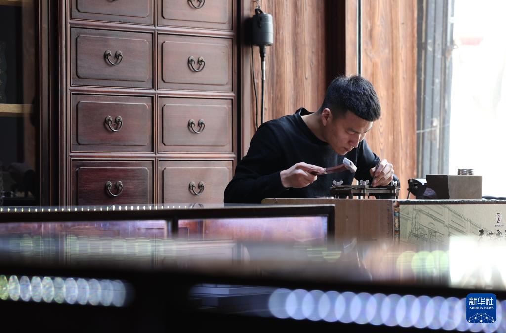 3月11日,孫朋在營口老世興銀樓工坊里對制作的銀飾進行鏨刻。