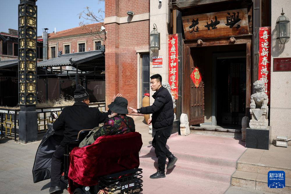 3月13日,孫朋(右)將一對來到店里訂做銀飾的老年顧客送出店門。