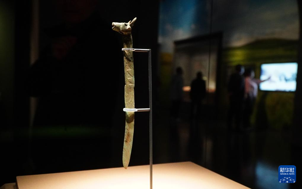 牛首青銅刀在山東博物館舉辦的鄂爾多斯青銅文明展上展出(4月5日攝)。