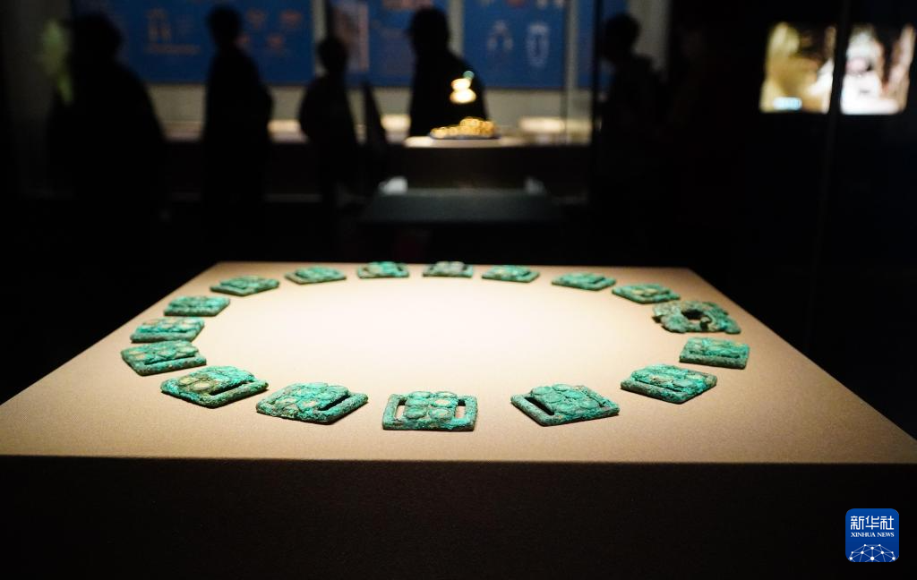 青銅鑲金帶飾在山東博物館舉辦的鄂爾多斯青銅文明展上展出(4月5日攝)。