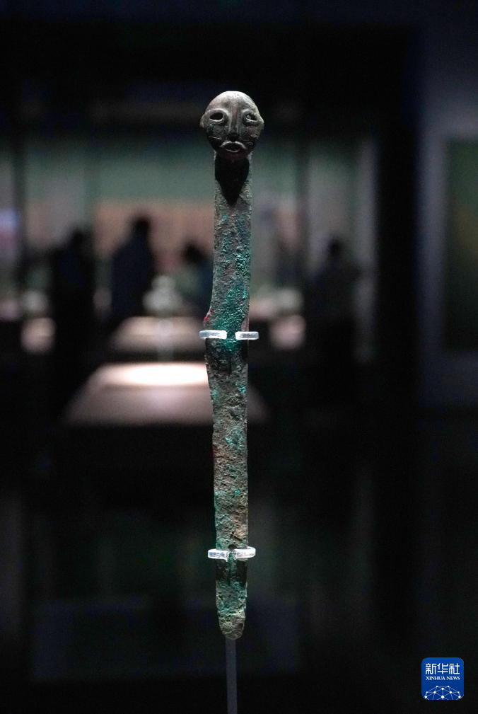 人首青銅刀在山東博物館舉辦的鄂爾多斯青銅文明展上展出(4月5日攝)。