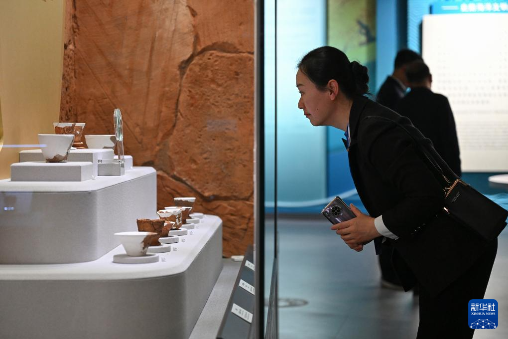 4月9日,觀眾在中國考古博物館殼丘頭分館內透過放大鏡看陶杯上的紋飾。